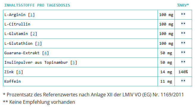 Per dagsdos innehåller Teralin: L-arginin (100 mg), L-citrullin (100 mg), L-glutamin (100 mg), L-glutation (100 mg), guaranaextrakt (50 mg), inulin från jordärtskocka (50 mg), zink (som citrat, 14 mg; 140 % NRV) samt koffein (11 mg). L-arginin och L-citrullin är kända som kvävemonoxidprekursorer och associeras ofta med blodcirkulation och prestationsförmåga. L-glutamin och L-glutation stöder cellulära processer, medan zink bidrar till ett normalt kolhydrat-, fettsyra- och makronäringsämnesmetabolism. Inulin fungerar som prebiotisk kostfiber, medan guarana och koffein ger milda aktiveringsimpulser. Sammansättningen är avsedd för daglig användning: en kapsel om dagen, tydligt doserad, utan komplicerade protokoll. (Källa: butikens ingredienssida)